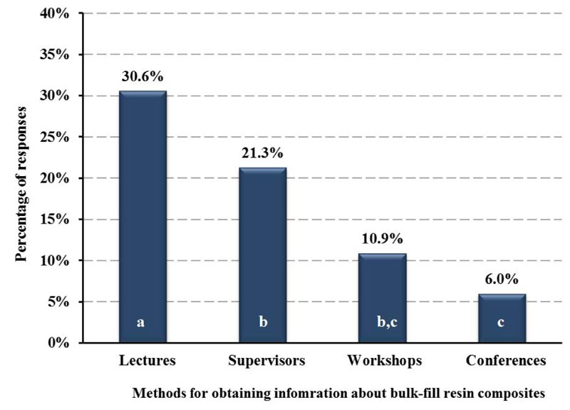 Table 2 shows the proportions of answers for each question in the knowledge section of the survey along with the results of statistical tests. The data is presented both out of the total participants of the survey (n = 183; percentages might not add to 100%) and out of the participants who responded yes to Q1 (n = 132; percentages will add up to 100%). Lectures were the main source of information (Fig. 3), SDR was the most commonly reported BF material by participants, and core build-up was the most frequent application reported (Fig. 4).