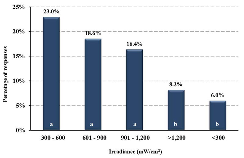 Regarding the minimum irradiance level in mW/cm2 for light cure used for BF resin composites, 300 - 600, 601 - 900, and 901 - 1200 mW/cm2 were the ranges commonly chosen with no statistical significance between the choices. (p> 0.05; Fig. 5). For conventional composites, however, 901 - 1200, 300 - 600, and 601 - 900 were the ranges chosen with no statistically significant difference between the choices (p> 0.05).