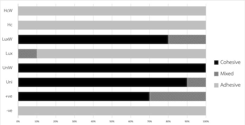 The distribution of fracture modes of debonded specimens is shown in Fig. (2). For the groups in which resin composite was bonded to pre-wetted PMMA surface, except the HcW group, the specimens are more likely to fail as a cohesive failure. The groups without MMA wetting mostly failed as adhesive failures. With the use of Scotchbond Universal Adhesive, nearly 100% displayed cohesive failures regardless of MMA wetting.