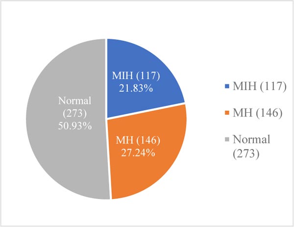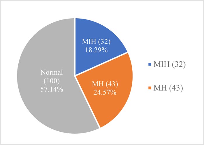 This study is considered one of the very few studies that studied the prevalence of both MIH and MH in the same population. Most of the studies investigated the prevalence of MIH. The results of our study showed a higher prevalence of MIH (20.96%) than MH (26.58%) in the studied sample, which goes in agreement with the results reported by Hussien et al. [13]. Their results reported that the prevalence of MH was higher than MIH (65.6% and 34.4%), respectively.