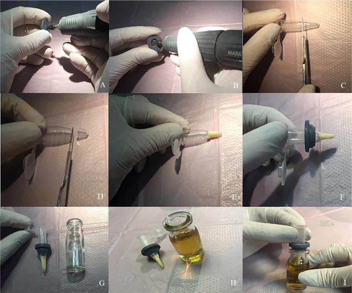 Microleakage was assessed by a two-chamber system according to Fathi et al. [6]. Briefly, the prepared root (cut at the cementoenamel junction) was placed in cut-end microtubes such that the coronal 2 mm of the tooth was inside the microtube and its root was out of it. The microtube was used to provide a space above the root canal orifice for saliva contamination. A hole was created in a penicillin bottle rubber stopper using an acrylic bur (Dentsply International, York, PA, USA) and handpiece. The microtubes were then inserted through the created holes, and the gaps between the tooth surface, microtube, and the rubber stopper were sealed with glue (UHU, Bühl, Germany) to prevent bacterial leakage from the outside environment to the testing environment (Fig. 1). The assemblies (microtube, tooth, and penicillin bottle rubber stopper) were sterilized through the exposure to ethylene oxide gas for 12 hours. After sterilization, sterile Brain Heart Infusion (BHI) broth (QUELAB, Montréal, Canada) was added to sterile vials in sterile conditions under a hood, and then the assemblies were placed in the vials such that the apical 2 mm of the root was placed in the BHI broth (Fig. 2). Moreover, all interfaces were sealed with glue. All samples were stored in an incubator at 37°C and 100% humidity for 5 days prior to the experiment to ensure sterilization, and it was observed that no contamination occurred. After ensuring sterilization, the human saliva was added to the samples every 3 days. All groups were monitored daily until turbidity was observed in the BHI broth and the turbidity of the BHI broth indicated microbial leakage in the liquid culture medium. All samples were monitored for 120 days as performed by Fathi et al. [6].