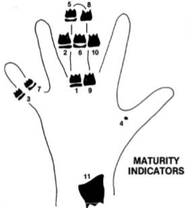Houston WJ, Miller JC, Tanner JM. Prediction of the timing of the adolescent growth spurt from ossification events in hand-wrist films. Br J Orthod 1979; 6(3): 145-52.