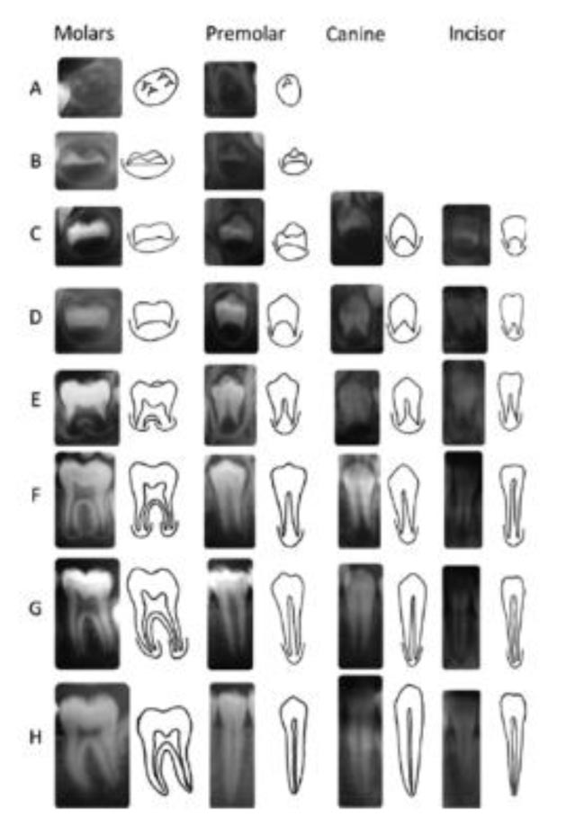 Dental developmental stages of Demirjian and Goldstein’s method: