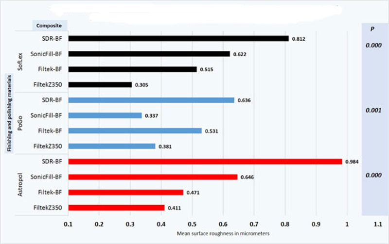 Statistically significant differences (P < 0.05) were observed between the Ra values of all composite materials tested with three finishing/polishing systems. Among composite materials, only Group-III showed a significant difference (P = 0.003) in Ra obtained using all three finishing/polishing systems. SDR Bulk-fill® and Filtek XT Z350® showed the highest (0.810 ± 0.373 µm) and lowest (0.365 ± 0.119 µm) Ra values, respectively. Individually, the highest Ra was recorded for SDR Bulk-fill® when it was finished/polished with the Astropol® system. SonicFill Bulk-fill® and SDR Bulk-fill® composites exhibited the lowest Ra values when they were finished with the PoGo® system.