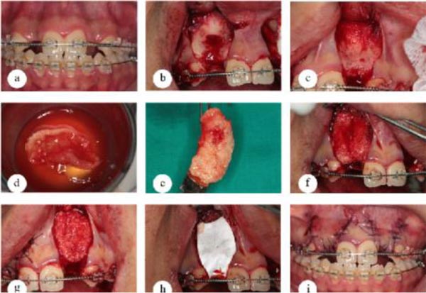 Fig. (1). Surgical procedures for horizontal ridge augmentation using MPM. (a) preoperative photograph. (b & c) the deficient alveolar ridge after flap elevation. (d & e) preparation of MPM. (f & g) MPM placed over the labial bone for group 1 and 2 respectively. (h) a collagen membrane used to cover MPM in group 1. (i) flap repositioning and suturing.
