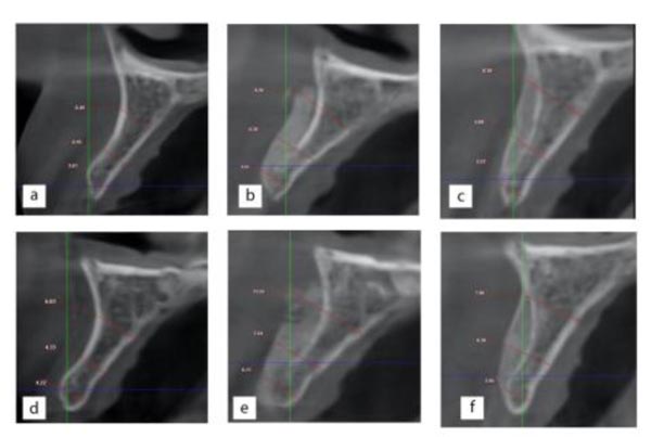 Fig. (2). Radiographic evaluation. Preoperative bone width for group 1 & 2 (a & d). Postoperative ridge measurement for group 1 & 2 (b & e). Final bone width after 4 months for group 1 & 2 (c & f).