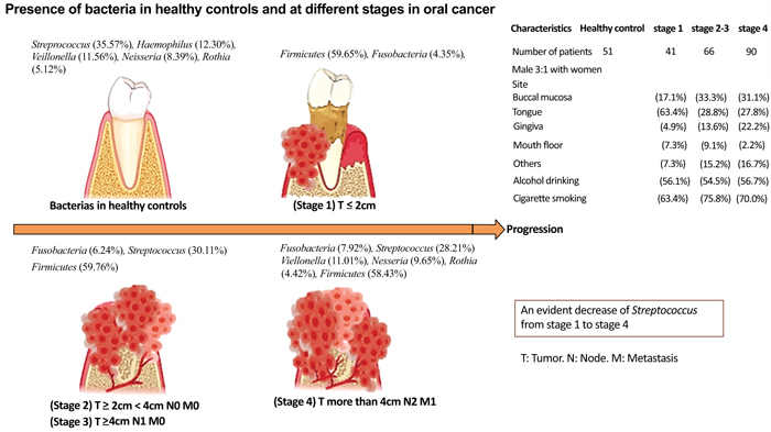 Different bacteria have been identified at different oral cancer stages. The clinical cancer stages of the 7th AJCC [69], and the oral microbiome present at each stage are depicted in Fig. (2). Yang C, et al. 2018, analyzed the microbiota in 248 samples from oral rinses that were collected within 1-3 weeks after the disease diagnosis in 51 healthy individuals and 197 OSCC patients at different stages, 53 using 16S rRNA V3V4 amplicon sequencing [53]. Fusobacteria increased significantly with the progression of oral cancer in comparison to healthy controls (2.98%) compared to OSCC stage 1 (4.35% p = 0.0015), stages 2 and 3 (6.24%, p < 0.0001), and compared to stage 4 (7.92% p < 0.0001), Fusobacteria was the most abundant in stage 4 [53]. As oral cancer progresses, Bacteroidetes and Actinobacteria decrease from stage 1 to stage 4 67. The main bacteria in OSCC stage 4 were: Streptococcus (28.21%), Veillonella (11.01%), Neisseria (9.65%), Haemophilus (9.37%), and Rothia (4.42%). The genera that increased the most was (Fusobacterium) (p < 0.0001), and the genera that decreased were: Streptococcus, Haemophilus, Porphyromonas, and Actinomyces (p < 0.0001) [53]. Firmicutes were the most dominant phylum in the oral rinse samples; being found in 58.40% of healthy patients, 59.65% in OSCC stage 1 patients, 59.76% in stage 2 and 3 patients, and 58.43% in OSCC stage 4.53 (Fig. 2).