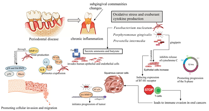 Evidence has demonstrated that a combination of risk factors such as smoking, alcohol abused, and poor oral hygiene increases the risk of oral cancer by inducing chronic inflammation and infection; these risk factor modify the local microbiota and host interactions, altering homeostasis of the oral environment [11, 13-15]. On the other hand, the development of OSCC in subjects who had never used tobacco or alcohol suggests that chronic periodontitis might be an independent risk factors for cancer development [16]. The causal relationship between specific oral bacterial infections and the development of OSCC, has been supported by the presence of some oral periodontopathogens such as Porphyromonas gingivalis (P. gingivalis), or Fusobacterium nucleatum (F. nucleatum); these periodontopathogens are known to stimulate different cytokines which facilitate cell proliferation, mutagenesis, apoptosis inhibition, oncogene activation, and angiogenesis [15, 17-20].