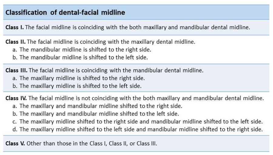 Clas I. The facial midline is coinciding with the both maxillary and mandibular dental midline (I). Class II. The facial midline is coinciding with only the maxillary dental midline. The mandibular midline is shifted to the right side (IIa). The mandibular midline is shifted to the left side (IIb). Class III. The facial midline is coinciding with only the mandibular dental midline. The maxillary midline is shifted to the right side ((IIIa). The maxillary midline is shifted to the left side (IIIb). Class IV. The facial midline is not coinciding with the both maxillary and mandibular dental midline. The maxillary and mandibular midline shifted to the right side (IVa). The maxillary and mandibular midline shifted to the left side (IVb). The maxillary midline shifted to the right side and mandibular midline shifted to the left side (IVc). The maxillary midline shifted to the left side and mandibular midline shifted to the right side (IVd). Class V. Other than those in the Class I, II, III or IV.