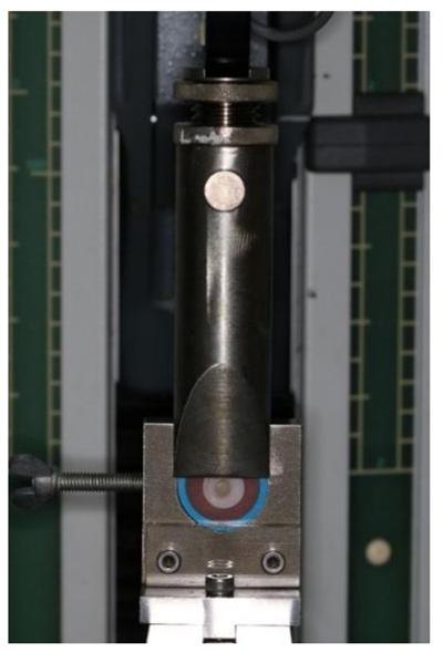 Bond strength (shear) was performed with the universal testing machine (Lloyd Instruments, LRX-Plus, AMETEK Lloyd Instrument Ltd., Hampshire, UK). Each specimen was mounted in a shear test jig that custom-made from stainless steel and a blade was intimately positioned to the specimen, as shown in Fig. (2). Only a polyester film strip (0.125 mm) could pass the gap between them. The specimen was loaded at 0.5 mm/min crosshead speed until it broke the bond. The shear bond strength of specimens was calculated as the load at failure/the area of the bonding surface.