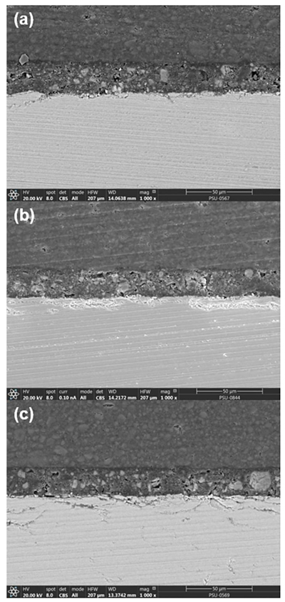 Fig. (3) shows the FESEM images of the bonding interface in the control group, negative group, and positive group. Three cross-section microscopy images showed two interfaces: resin composite-resin cement interface and resin cement-zirconia interface. The representative images showed a similar structure as the resin composite firmly adhered to the resin cement layer; neither gaps nor voids appeared at this interface. The zirconia bonding surfaces were treated with 50 µm aluminum oxide particles resulting in a little wave and some voids appeared at this interface. The middle layer was the resin cement layer with various sizes of porosity spreading all over the layer.