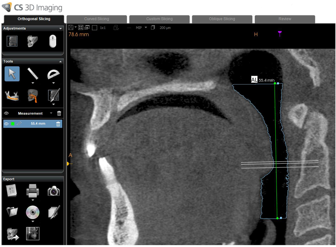 Using dedicated CBCT software (Kodak CS 3D imaging version 3.8.6, Carestream, Rochester, NY, USA), one calibrated oral radiologist (MA) with 12 years of experience with CBCT was responsible for drawing the path of the oropharyngeal airway from the posterior nasal spine to the superior border of the epiglottis on a midsagittal section (Fig. 1). The software subsequently and automatically generated the following values: airway volume (AV: cm3), minimum cross-sectional area (MCA: mm2), minimum anteroposterior distance (MAD: mm), and minimum right to left distance (MRD: mm). In addition to this, airway length (AL: mm) was manually measured by drawing a vertical line connecting the superior and inferior border of the oropharyngeal airway (Fig. 2).