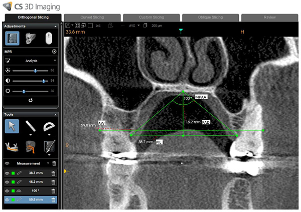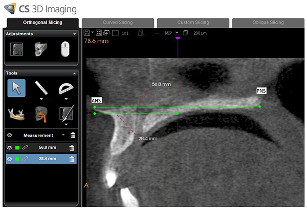 A KODAK 9500 Cone Beam 3D System (Carestream, Rochester, NY) CBCT apparatus with flat-panel detector was used. CBCT scanning parameters were: 0.2-mm as a voxel size, 90 kV as a tube voltage, 10 mA as a tube current and 10.8s as an exposure time. The patient was asked to stop swallowing and to keep teeth in maximum intercuspation. The occlusal plane was parallel with the floor and the field of view was 15x9 cm.