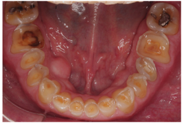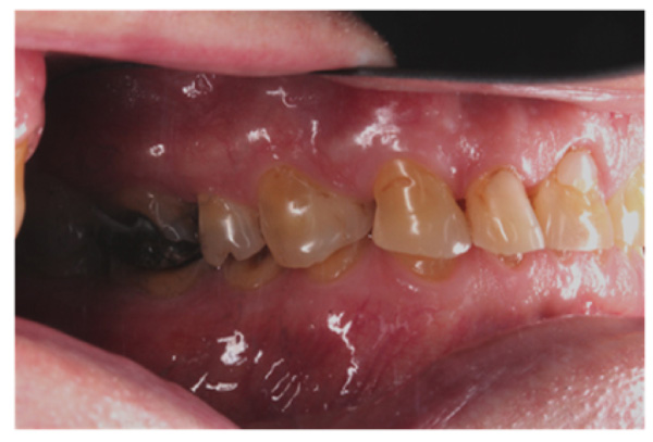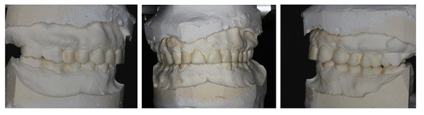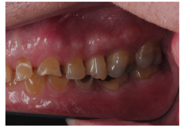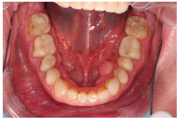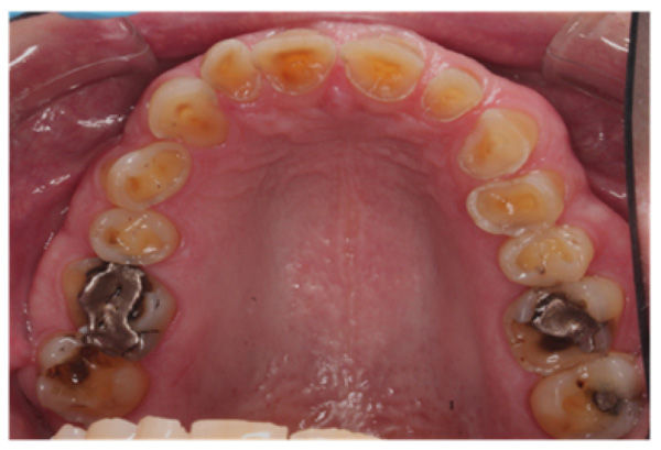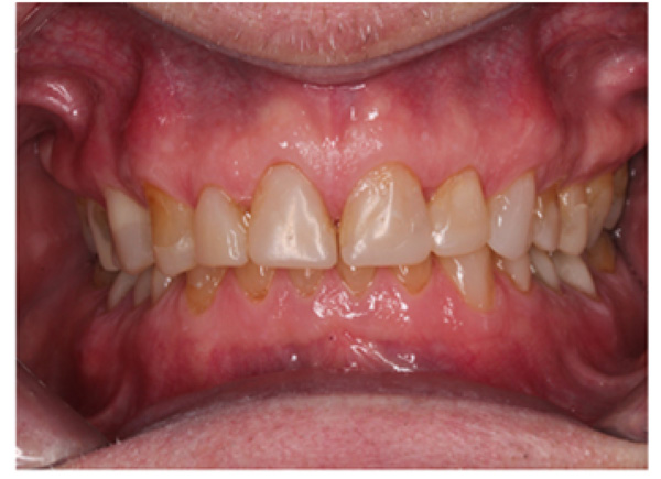 The male, aged 57 years, was mainly concerned with the poor appearance of his teeth with short and discolored upper incisors. History revealed that he suffered from gastric reflux for 25 years, for which he was prescribed Ranitidine and was advised to self-medicate with cider vinegar. Furthermore, he divulged that he ground his teeth at night and during the day and had a high intake of carbonated cola drinks. On examination, dentine was exposed in several areas, and to a significant extent, on the incisal aspects of the lower incisors, the palatal surfaces of the upper incisors, and the occlusal surfaces of the molars. Mandibular tori were present.