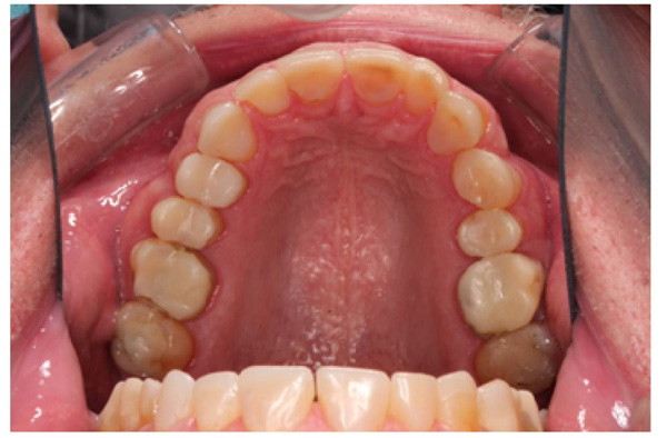 This case report follows the CARE guideline [8]. A 57-year-old British male presented to Hamdan Bin Mohammed College of Dental Medicine, who was concerned about the appearance of his teeth. The only relevant medical history was that he suffered from Gastro-Esophagealreflux Disease (GORD) for 25 years, for which he self-medicated with Ranitidine for 10 years, a histamine H2 antagonist. He took 300mg, the normal daily dose, regularly without medical supervision. Further questioning revealed that the patient had a high intake of carbonated cola or fizzy cola drinks as he had previously worked for a drinks manufacturing company for 25 years. He also admitted to bruxism. After the examination and on further questioning regarding diet and habits, the patient stated he drank apple cider vinegar after listening to a healthcare expert on the radio stating the health benefits of apple cider vinegar and that it reduced gastric reflux. Thereafter, the patient started diluting apple cider vinegar with water and drank a glass every morning over the previous 2 years.