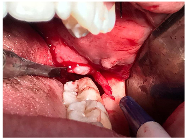Injuries to the structure in the mucoperiosteal detachment step may occur [4]. In the present case, the lower third molar was in Pell & Gregory's I-B position [15]. Thus, the incision was carefully made on the mesiovestibular third of the third molar extending to the mesial of the first molar, with a vertical incision anterior to the interdental papilla towards the groove fundus to avoid rupture of the retromolar canal, since the retromolar canal and the third molar appeared, radiographically, to be united. After the exeresis of the dental element, one can observe the vasculonervous bundle of the retromolar canal.