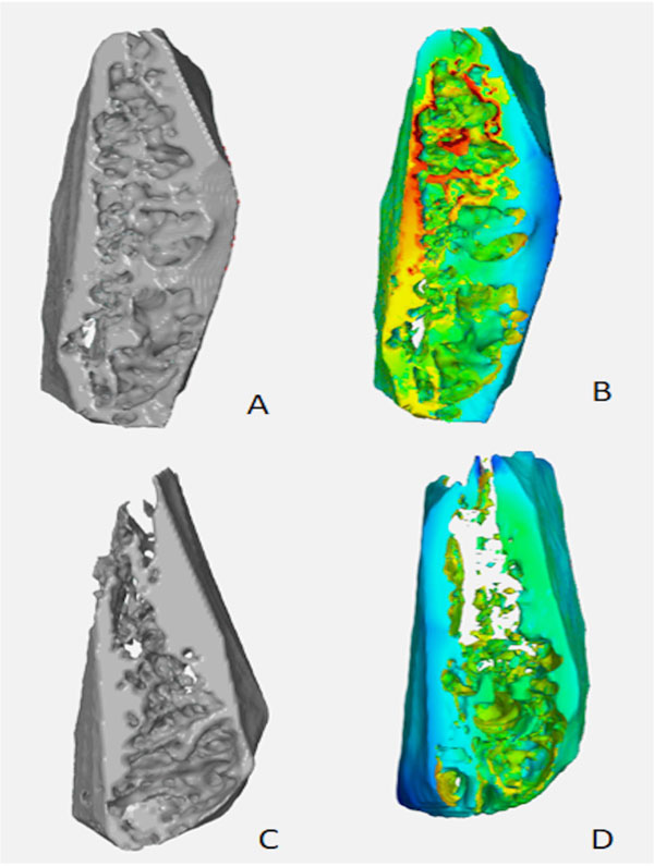 A Volume Of Interest (VOI) comprising only trabecular bone was manually determined. Bone parameters cited above (BvTv, BsBv, TbTh, TbSp) were automatically calculated by the software Imalytics (Fig. 1a-d). In addition, Standard Tesselation Language (STL) tridimensional (3D) models representing the selected VOI were created and exported to the software GOM Inspect. A representative visual analysis was performed using a color-coded map to compare the experimental groups with the gold-standard (Fig. 2a-d).