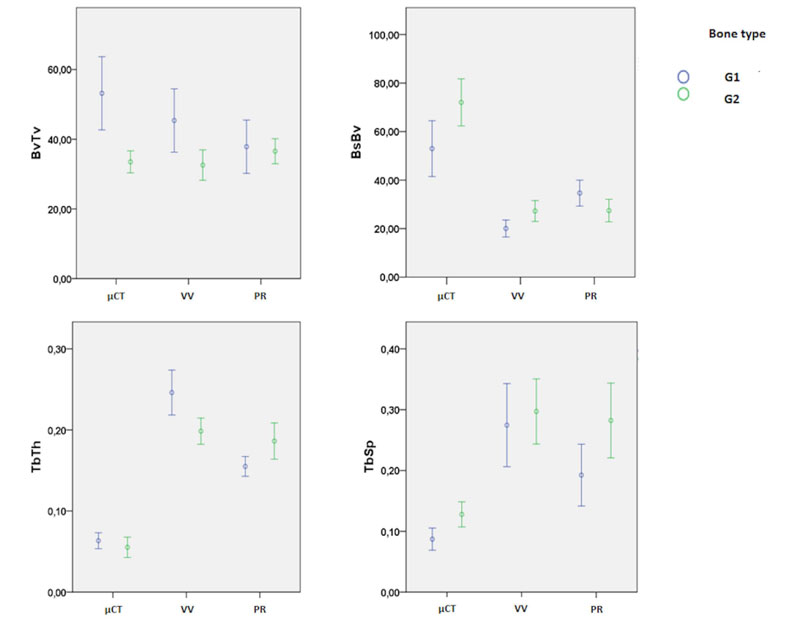 Bone parameters assessed by CBCT and µCT are represented in Fig. (3). Measurements of BvTv and BsBv were underestimated by CBCT. However, for BvTv, this difference was not statistically significant (VV: p=0.13; PR: p=0.06). For BsBv, both scanners differed statistically from µCT (VV p= 0.00; PR p=0.01). Conversely, TbTh and TbSp were overestimated by both scanners (p<0.01).
