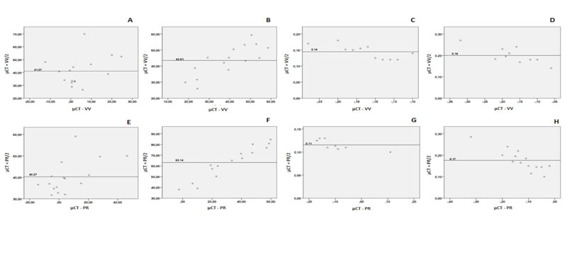 Bland-Altman plots show the relationship between the arithmetic mean of CBCT and µCT measurements with the measurement error (µCT - CBCT measurements). Overestimated values by CBCT are shown as negative values (Fig. 4a-h). The results suggested that for BsBv, the higher the mean values, the higher the underestimation by CBCT. Conversely, for TbSp, higher means are related to higher overestimated measurements.