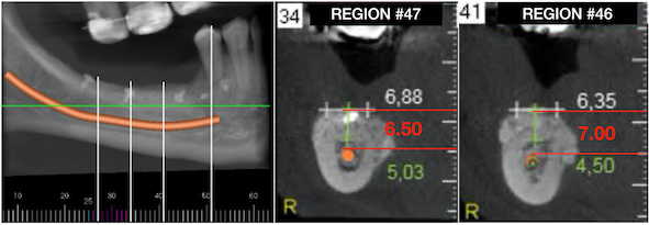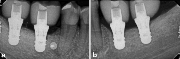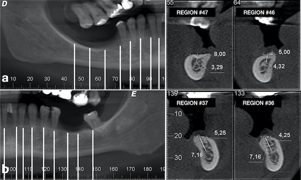 A 49-year-old patient attended a private dental office in the city of Fortaleza, CE, Brazil, for rehabilitation of an atrophic posterior mandible. During anamnesis, no systemic disease was reported. Clinical evaluation showed absence of teeth #36, #37, #46, #47 and #48 and significant bone resorption in these regions (Fig. 1a), including extrusion of teeth #16, #17 and #18 (Fig. 1b). Cone-beam computed tomography (CBCT) showed that the patient had a limited bone height in the region of teeth #46 and #47 with a distance of 3-4 mm between the bone crest and mandibular canal thus hindering the placement of implants (Fig. 2a). With regard to the left lower region, there was enough bone for the placement of 6-mm implants in the region of teeth #36 and #37, as well as the presence of Grade-III furcation defect and alveolar bone loss in the region of tooth #38 (Fig. 2b). The case report was approved by the Research Ethics Committee of the University of Santo Amaro. Before the treatment, the informed consent form was presented and signed by the patient.