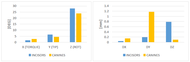 All the planned movements along with actual ones of the teeth, are reported in Tables 1-9.