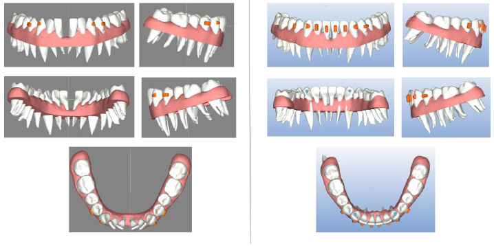 To provide mechanical retention and support for the desired rotation, vestibular attachments were planned on canines and first premolars, and pressure points on the lingual side of canines.