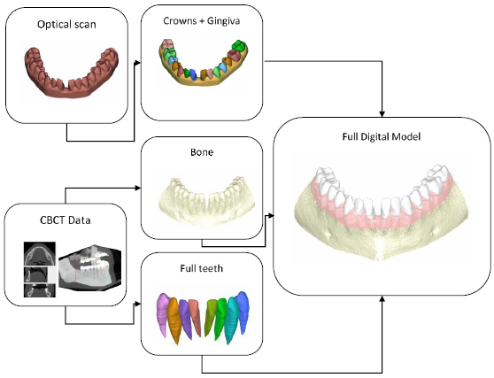 The digital model of the patient’s mouth anatomy was obtained by combining digital impressions with 3D data from a Cone Beam Computer Tomography (CBCT). The methodology used allowed for the merging of these multi-source data to obtain full tooth anatomies including crown and root shapes, the gingiva’s anatomy and maxillary/mandibular bone anatomies. Highly accurate crown and gingiva geometries were obtained from optically scanned data that allowed the best resolution and accuracy, while root geometries were obtained by processing CBCT data (Fig. 3) Digital model acquisition flow.