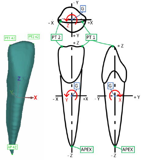 For each tooth, axes and principal points were identified. The z-axes according to Di Angelo et al. [11] were defined approximately perpendicular to the occlusal plane and associated with the lower moment of inertia of its geometrical model. The mesiodistal (y-axis) and the buccolingual (x-axis) directions were set orthogonal to the z-axis, while the apex and principal points (two for incisors and one for canines and premolars) were defined as depicted in Fig. (5).