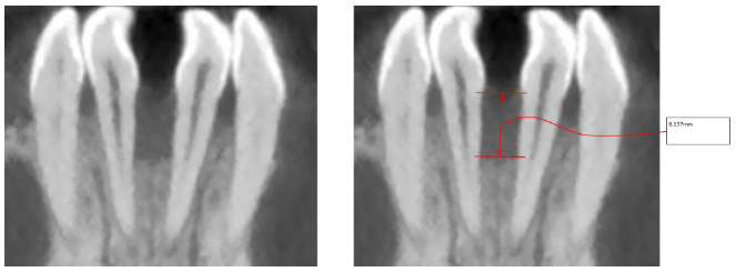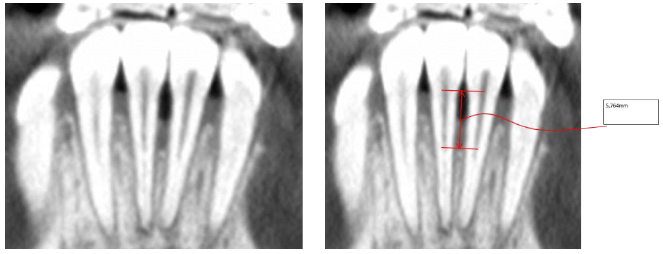 At the first appointment, all data were collected: intra and extra oral photos and the CBCT that also showed a vertical bone loss between the lower central incisors. It was decided to perform an initial CBCT to radiographically assess the patient's bone condition, considering the clinically evident recessions. Vertical defects were considered a sign of progressive or advanced disease and were associated with further periodontal bone loss and tooth loss [8].