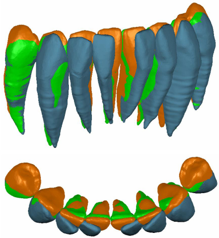 The 3D models obtained by using optical and tomographic scans had to be merged into one model in order to allow treatment planning. First of all, different models are needed to be aligned in a common reference system. The optical 3D models were coarsely aligned with the corresponding models from the CBCT data set (e.g., manually selecting at least three common points or by manually moving the 3D models), and successively, the obtained alignment was refined by means of a registration algorithm (best fine alignment or Iterative Closest Point technique). The final model of the teeth was obtained by merging optically scanned crowns with root data from CBCT. This provided fully closed models composed of the most accurate representation for tooth crowns. Thus, the final anatomical digital model was composed of these teeth, the gingiva from the optical scan and the bone from the CBCT.