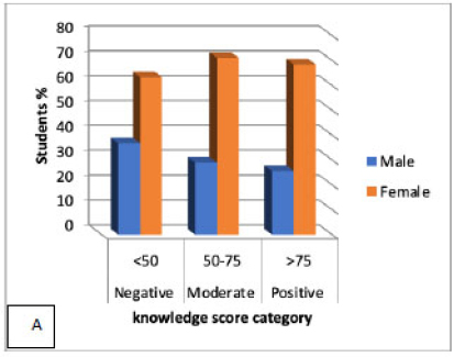 The distribution of knowledge and attitude scores according to gender and discipline were shown in Figs. (1 and 2), respectively. The Chi-Square Goodness of Fit Test indicated that the gender group and discipline group were similarly distributed among the knowledge and attitude score category (p-value > 0.05) as shown in Figs. (1 and 2).