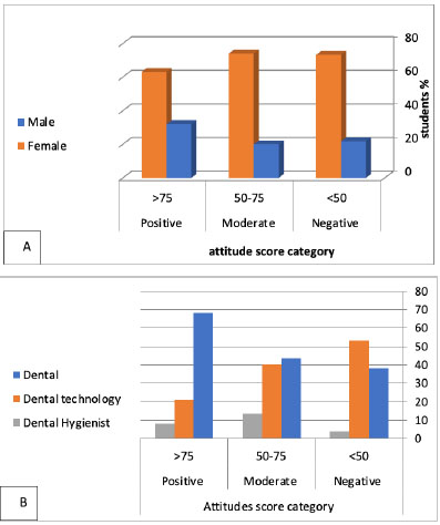 Statistically significant difference was found in relation to students' specialization (p-value ≤ 0.05). None of the dental hygienist students had a negative attitude about infection control, while most of participants with a negative attitude were dental technology students (84.6%). No statistically significant difference (p>0.05) was found between groups in regard to cross-infection knowledge, where the level of knowledge ranged from moderate to good.