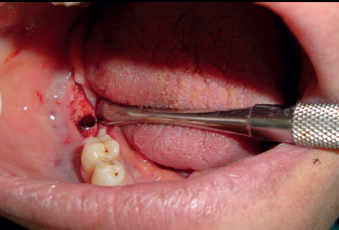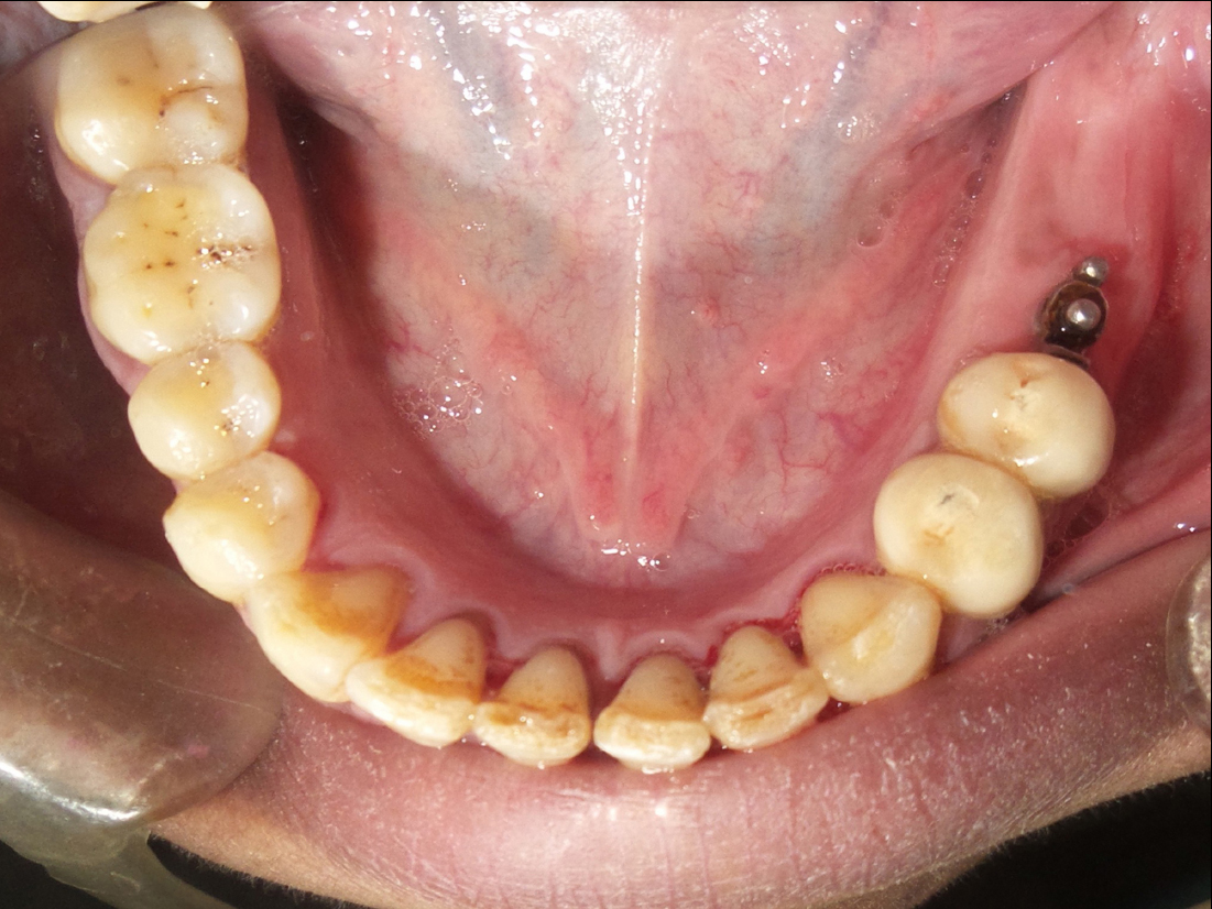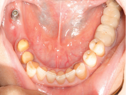 A vacuum stent surgical guide was made for each patient to be used during the surgery to determine the position of implant installation; Anesthesia (Inibsa Artinibsa 4%, Spain) was given, then the surgical guide was placed in the patient's mouth, and the probe was used to mark the proposed site for implant placement. A crystal incision was made extending 5 mm mesial and distal to the marked implant site. A full-thickness mucoperiosteal flap was reflected. The implant osteotomy of 10 mm length and 3.6 mm diameter was sequentially drilled, then the implant (Superline; Dentium, Korea) was installed in the osteotomy site (Fig. 2), and its cover screw was tightened, and the flap was sutured. After three months, the healing abutment was screwed to the implant and left for ten days for gingival healing and formation of the gingival collar and then replaced by the final abutment. The first and second premolar teeth in the distal extension side were reduced and prepared with sub-gingival finishing lines ready for crowing (Fig. 3). The final impression was made using a rubber base after changing the final abutment with impression-transfer (closed tray). Composite temporary (Protemp™ Plus, USA) crowns were made, then finished, polished, and cemented temporarily.