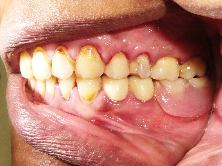 After surveying of the primary cast, the design of the removable partial denture included double Aker’s clasp on the first and second molar of the intact side. A Reverse Aker clasp on the last abutment tooth on the edentulous side, lingual bar as a major connector, cingulum rest on canine and a meshwork extension at the free end saddle. The final impression was made for the lower arch using a medium body rubber base in a custom tray to obtain the master cast. After duplication, construction of the metal framework was done and then the metal framework was tried for accuracy and proper fit. An altered cast impression was also made. A face bow record was made for mounting the upper cast on a semi-adjustable articulator. An inter-occlusal wax record was carried out for mounting the lower cast. Semi–anatomical cross-linked acrylic teeth were set up, and try-in was carried out in the patient’s mouth, and then it was processed into heat cure acrylic resin.