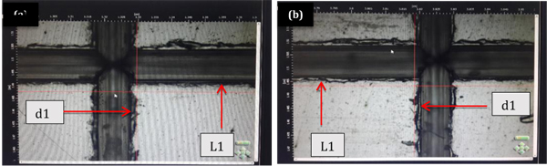 Fig. (3). Image analyzer view of the stainless-steel test die (a) L1 and d1, (b) L1 and d2.