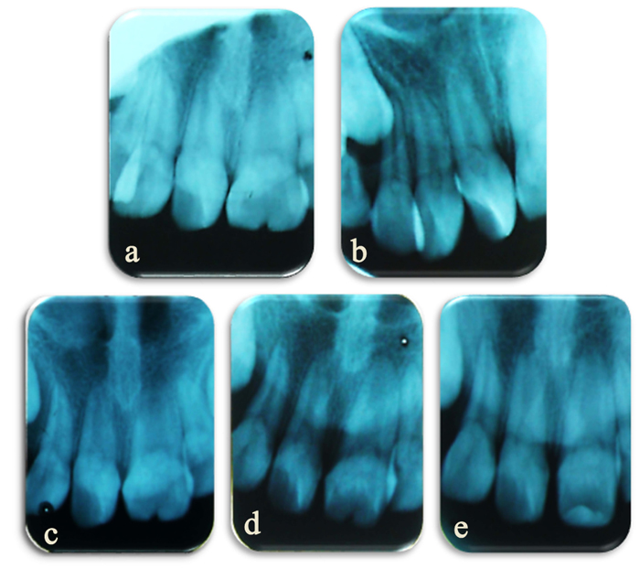 Upon clinical and radiographical examinations, dental findings were as follows: a unilateral, large, wide permanent maxillary left central incisor crown with a notch in the incisal edge. Radiographically, a single large pulp chamber and a single incomplete root formation were observed. All of these data came under the gemination dental anomaly. Moreover, two identical permanent maxillary lateral incisors were present on the right side, indicating a supplemental supernumerary lateral incisor. Teeth were vital, and overcrowding in the maxillary anterior teeth region was observed (Fig. 1a). Besides, the girl was still in mixed dentition and suffered from multiple dental caries due to poor oral hygiene.