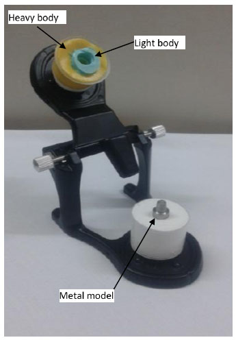 Small perforated plastic cups (20 mm diameter and 20 mm height) were used as impression trays to make polyvinyl siloxane (Panasil, Kettenbach Dental GmbH & Co. KG, Germany) impressions of each metal model. Cups were attached to the upper member of an articulator by means of magnetic rings. The metal models were attached to the lower member and centered into the middle of the cup (Fig. 2). For making impressions, light body (type 3; Panasil, Kettenbach Dental GmbH & Co. KG, Germany) was injected around the surface of the metal model, and the cup attached to the upper ring was filled with the heavy body (Putty soft, type 0; Panasil, Kettenbach Dental GmbH & Co. KG, Germany). Then the articulator was closed to allow the impression material to set. After setting, the impression was separated from the metal model. Excessive impression material was trimmed away with a scalpel. The impressions were randomly allocated into two groups of 15 each, according to the type of used die material. For the stone group, dental die stone Type IV (Ultra hard Snow Rock Die Stone, UD/Korea) was mixed according to the manufacturer’s recommended water/ powder ratio (W/P = 20 ml/100g), under 710 mm Hg vacuum for 60 seconds. The Type IV stone was vibrated into the impression and allowed to set for one hour at room temperature and humidity before removal from the impression.