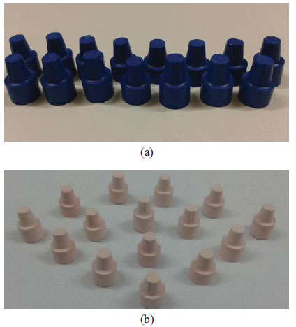 Exakto-Form (Bredent, Germany) model resin was a two-component material. Each component was stirred completely before mixing to obtain a homogenous mixture. Then component B was added to component A and mixed thoroughly for 30 seconds until the uniform color (blue) mixture was obtained and poured swiftly into the impression. After 30 minutes of mixing, the dies were removed and allowed to achieve the final set. Dies with any defects like air bubbles or imperfections were discarded and refabricated. Fig. (3) shows that the dies are made of two different materials.