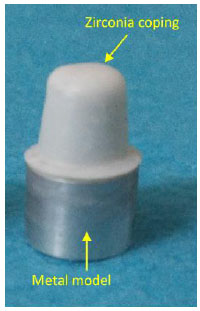 Copings were cemented to their corresponding metal models with glass ionomer cement (GC: Gold label luting and lining cement, GC corporation Tokyo, Japan) using a rocking motion (Fig. 4). Immediately after removing the excess cement and in order to get a uniform load on all the specimens, the coping-metal model assemblies were placed in a chewing simulator machine (SD Mechatronik, chewing simulator CS- 4, Germany) under a constant load of 50 N for 10 minutes.