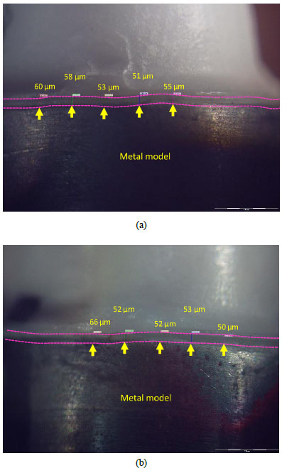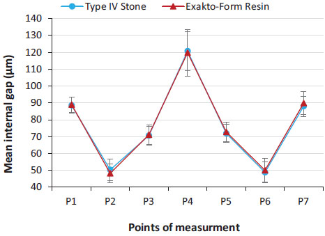 Mean value of marginal gap for Type IV stone and Exakto-Form groups were 54.31 ± 4.11 μm and 56.25 ± 4.24 μm, respectively. Mean values of the internal gaps for both groups ranged from 48 μm to 120 μm.