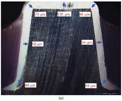 A variety of methods are used to evaluate the marginal adaptation of dental CAD/CAM restorations, such as direct viewing, cross section view, impression replica technology, laser videography, profilometry, x-ray microtomography, three-dimensional (3-D) superimposition analysis, and clinical examination [32- 34]. Although in the cross-sectioning technique used in this study, the models have to be sacrificed, the measurements are more accurate and repeatable [35]. It should be noted that when measuring the position of the internal gap in the metal model–coping assemblies, errors could arise due to the cutting operation. Utilizing a water jet cutter in this study had several advantages, such as the ability to cut the materials without interfering with its inherent structure as there was no “heat-affected zone” [36]. Also, it produced an excellent edge quality, which decreased the time required for polishing the surfaces as there was a few or no saw-induced metal flash or smearing, which are generally found in the traditional saw cutting technique [37].