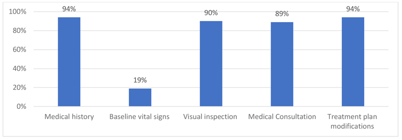 Of the total 270 participants, the majority reported that they take medical history (94%), perform visual inspection (90%), consult with patients’ physician when needed (89%), and modify treatment plan as necessary (94%). However, only 19% of them routinely take baseline vital signs for their patients and 52.6% have valid BLS certification. Only 29.6% and 16.3% of dental practitioners have reported that they have all essential drugs and equipment, respectively.