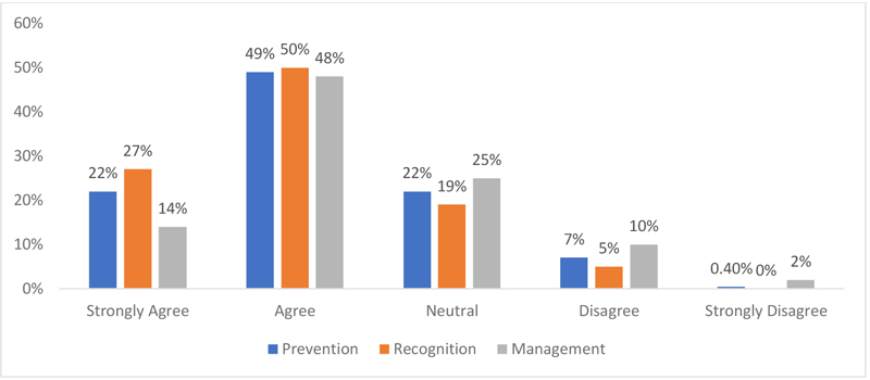 It should be noted, however, that only 29.6% and 16.3% of dental practitioners reported to have all essential drugs and equipment, respectively. When dental practitioners were asked about their training in medical emergency, the highest percentage reported to agree with the adequacy of their training to prevent (49%), recognize (50%), and manage (48%) medical emergencies (Fig. 3). Furthermore, 51.9% of practitioners recommended the need for additional training in medical emergencies, such as continuous education courses and workshops. No significant differences were found when comparing the perspectives of specialists and non-specialists’ dental practitioners, as shown in Table 2.