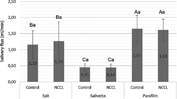 Salivary flow mean (mL/s) and standard deviation for comparison of salivary collection methods, and the presence of NCCL. Capital letters for comparisons of salivary collection methods; and Lowercase letters for comparisons of subjects with and without NCCL. (Two-way repeated measures analysis of variance and Tukey Test; p<0.05).