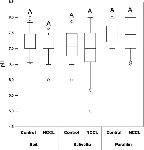 pH median comparing salivary collection methods and the presence of NCCL. Capital letters for comparisons for all groups. (Kruskal-Wallis and Tukey Test; p<0.05).