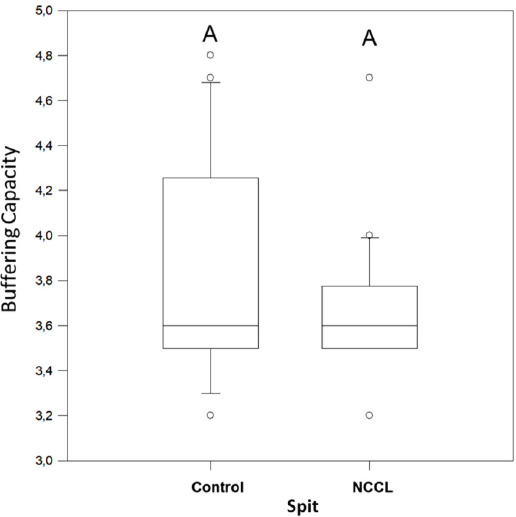 Buffering capacity median for spit salivary collection method comparing subjects with and without NCCL. (Mann-Whitney; p<0.05).