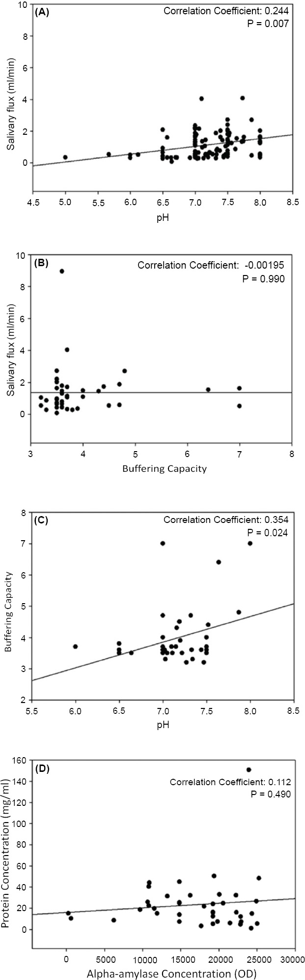 Pearson analysis (p<0.05) for correlation between pH and salivary flow (mL/s) (A), buffering capacity and salivary flow (mL/s) (B), pH and buffering capacity (C) and alpha-amylase concentration (U/mL) and protein concentration (U/mL) (D).
