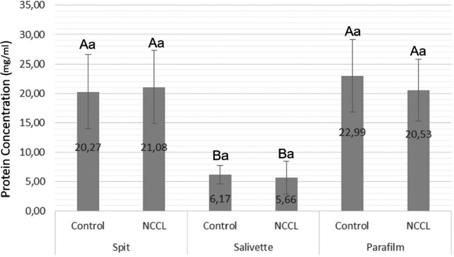 Although the salivary total protein concentration remained consistent, irrespective of the presence of NCCL, this parameter was affected by the salivary collection method. The samples obtained by the Salivette collection method demonstrated lower mean protein concentration in comparison with the other collection methods. This may be attributed to the device’s poor recovery and absorption capacity for certain protein compounds [51]. Furthermore, variations in protein excretion rates may be observed due to variations in the volume of saliva prior to collection or the absence of pre-concentration. This statement was supported by the unique profile exhibited by the Salivette collection method, which demonstrated a higher concentration of organic and inorganic compounds in the stimulated saliva compared to the non-stimulated collection methods [52, 53].