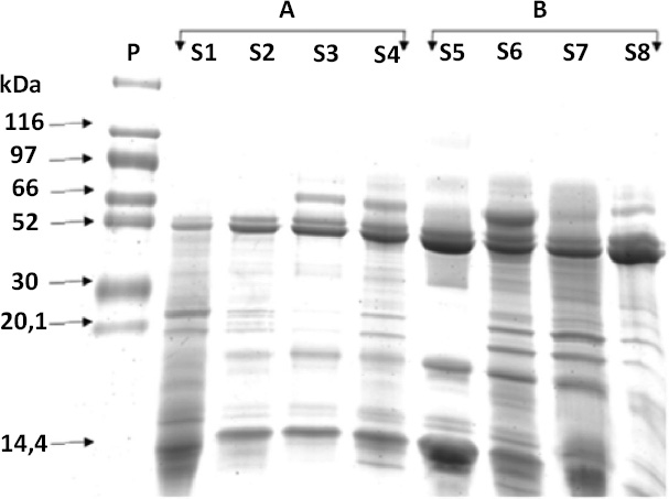 Salivary protein profile represented by relative mass (Mr), comparing the presence of polypeptides visible in saliva samples of the individuals without NCCL (A) and with NCCL (B), in SDS-PAGE.