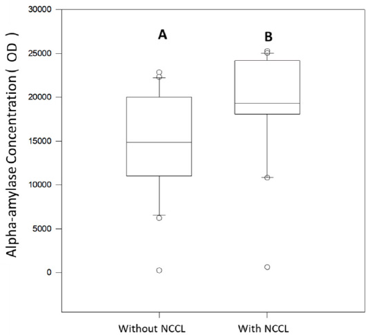 Alpha-amylase concentration (U/mL) median for spit salivary collection method comparing subjects with and without NCCL. (Mann-Whitney; p<0.05).